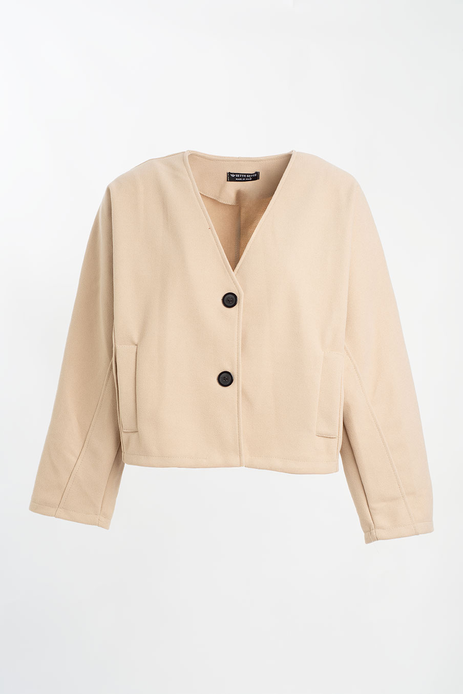 Casaco  de corte reto e curto, com decote em V e fecho frontal com dois botões. Modelo simples e elegante, ideal para um look moderno e versátil.