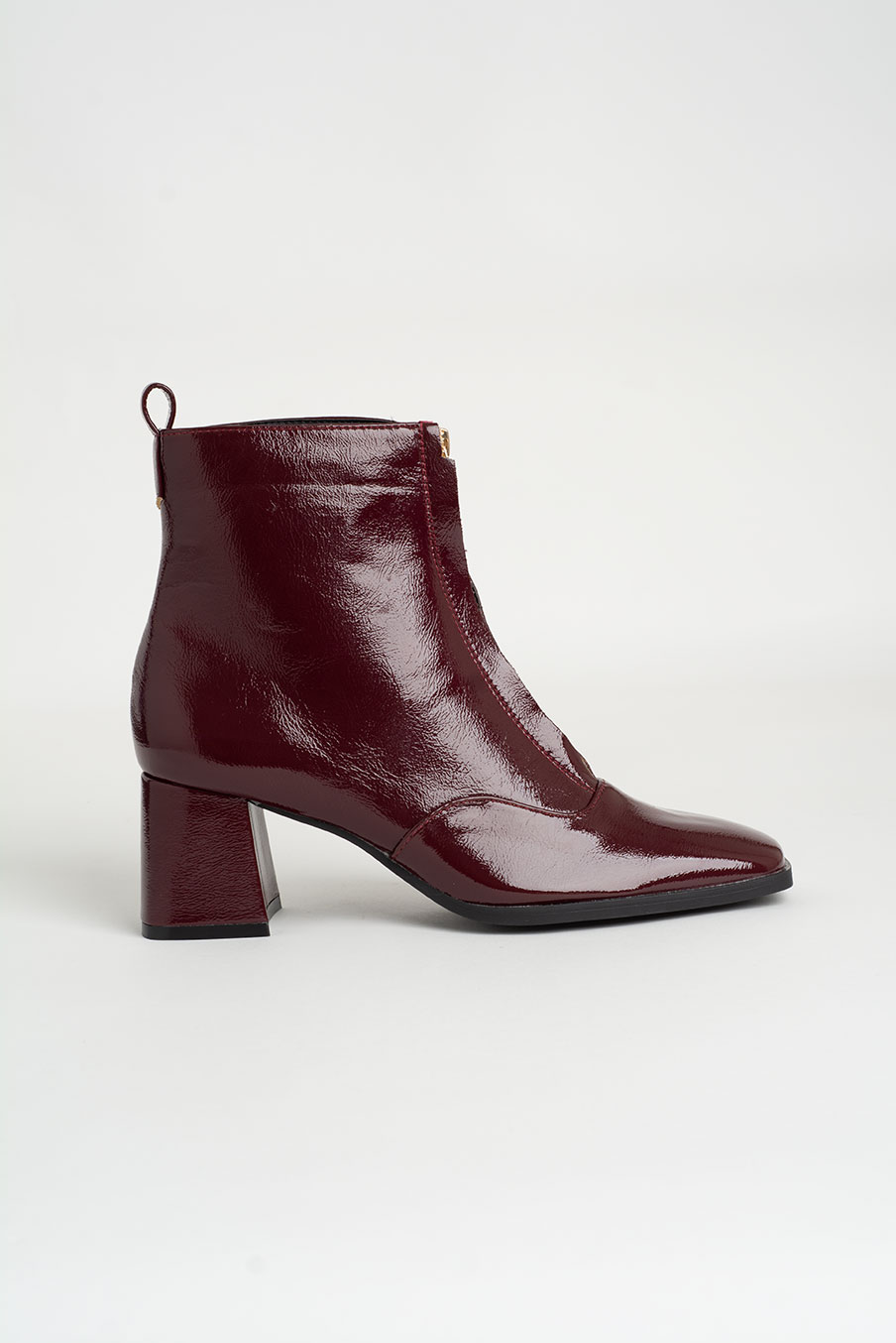 Bota de cano curto com biqueira quadrada e fecho frontal, combinando elegância e modernidade num só modelo. O acabamento brilhante e o design estruturado garantem um visual sofisticado e distinto.