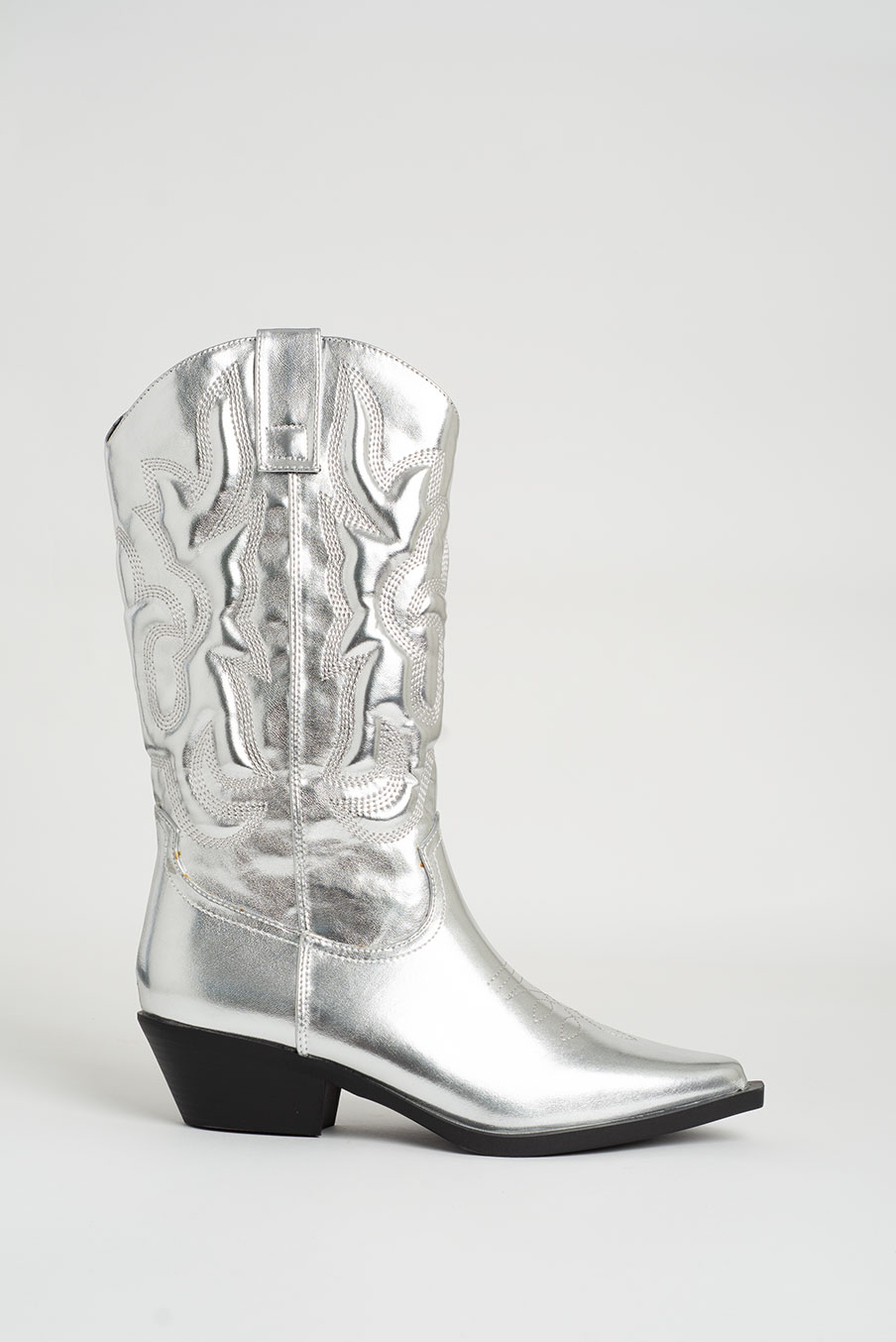 Bota de inspiração cowboy com acabamento metálico e bordados decorativos, perfeita para quem gosta de se destacar com estilo e atitude. O design moderno combina elegância com um toque irreverente.