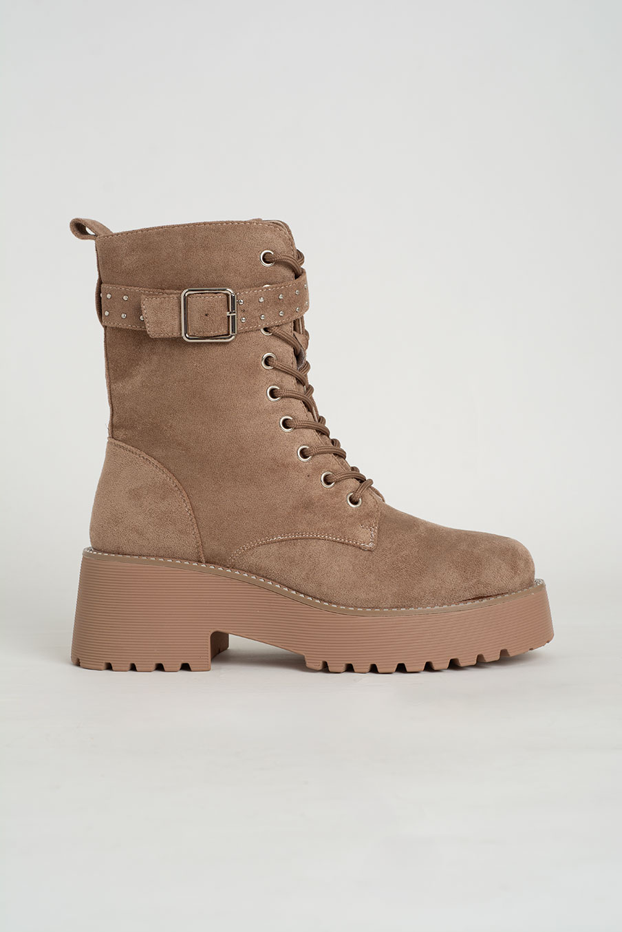 Bota de cano médio em camurça castanha, com sola chunky serrilhada para um visual moderno e cheio de personalidade. O modelo combina atacadores frontais com detalhe de fivela e tachas no tornozelo, que dão um toque edgy e sofisticado ao mesmo tempo.