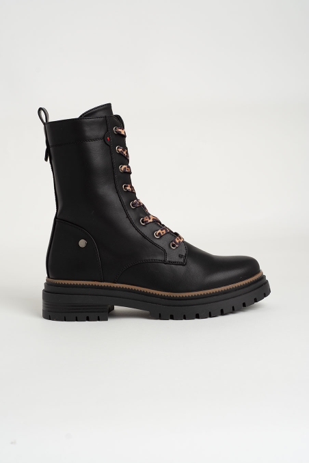 Bota de atacadores com design moderno e detalhes contrastantes nos cordões, perfeita para um visual urbano e descontraído. A sola tratorada garante atitude e conforto em cada passo.