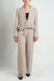 Conjunto composto por calça e blazer com folhos em baixo.