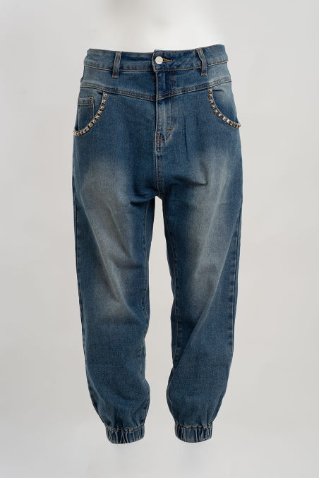 Calças em ganga macia com elástico na perna e detalhes em tachas metálicas nos bolsos — um toque de rebeldia que não passa despercebido. O corte descontraído e o tecido confortável tornam esta peça perfeita para o dia a dia, combinando estilo casual com personalidade.