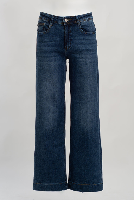 Com cintura média, perna larga e tecido em ganga ligeiramente elástica, esta peça adapta-se perfeitamente às curvas sem perder a estrutura.