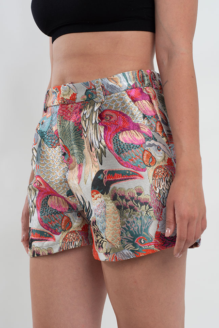 Calção padrão animal, tecido encorpado e com elástico na cinta.