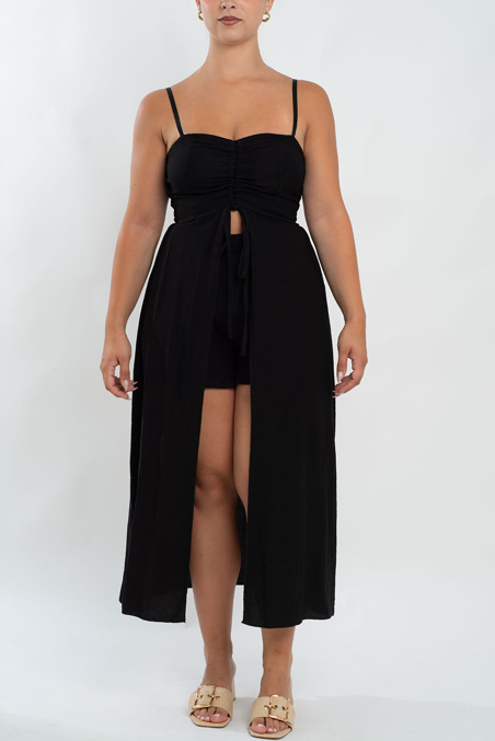 O top tem copa com detalhe no peito para repuxar e é mais comprido atrás, super trend.