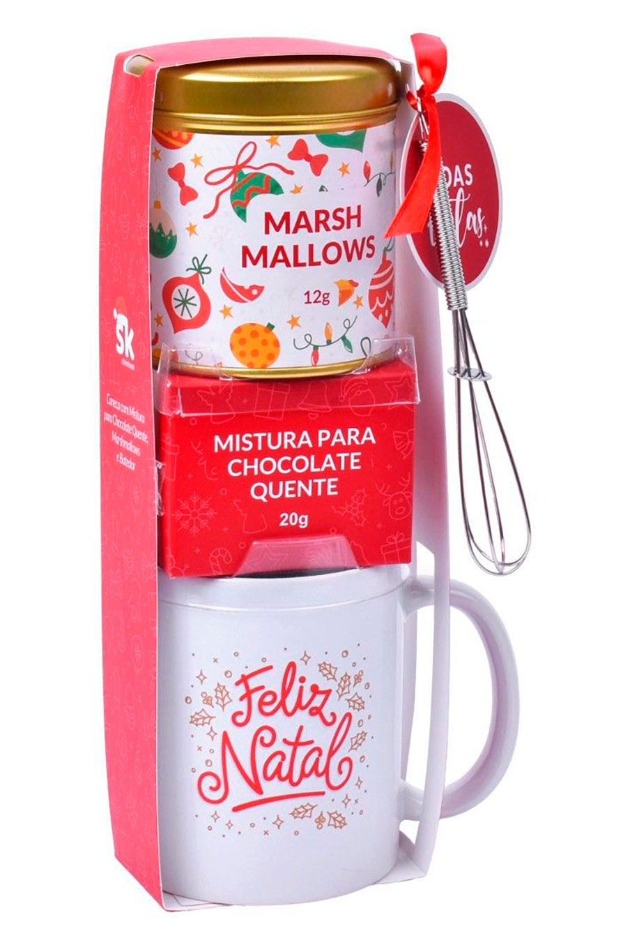 Inclui caneca temática “Feliz Natal”, mistura de chocolate quente (20g), marshmallows (12g) e mini vara de arame. Produto decorativo e alimentar sazonal.