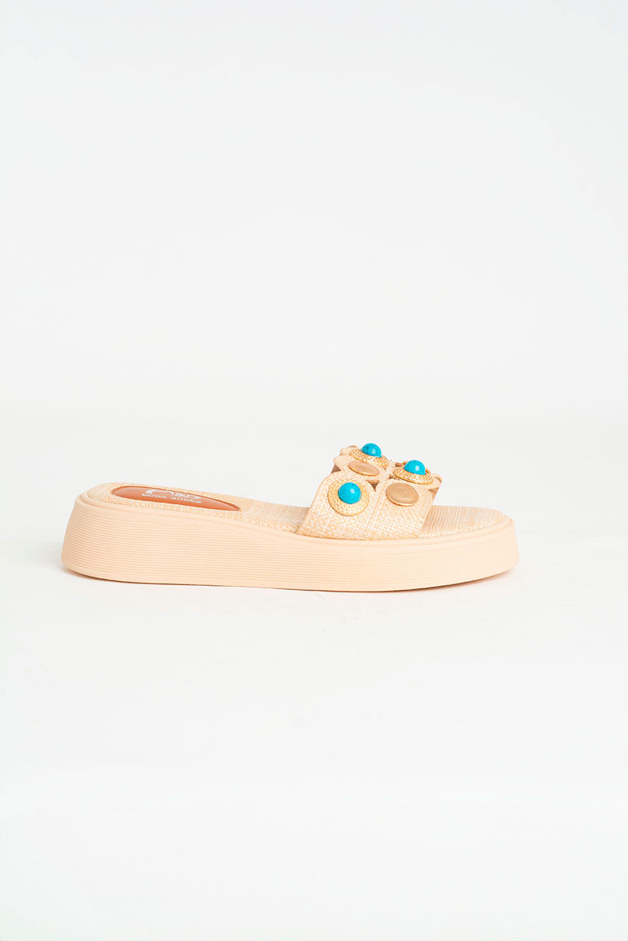Confeccionada em material texturizado, ela se destaca pelos apliques dourados e pedras em tom turquesa.