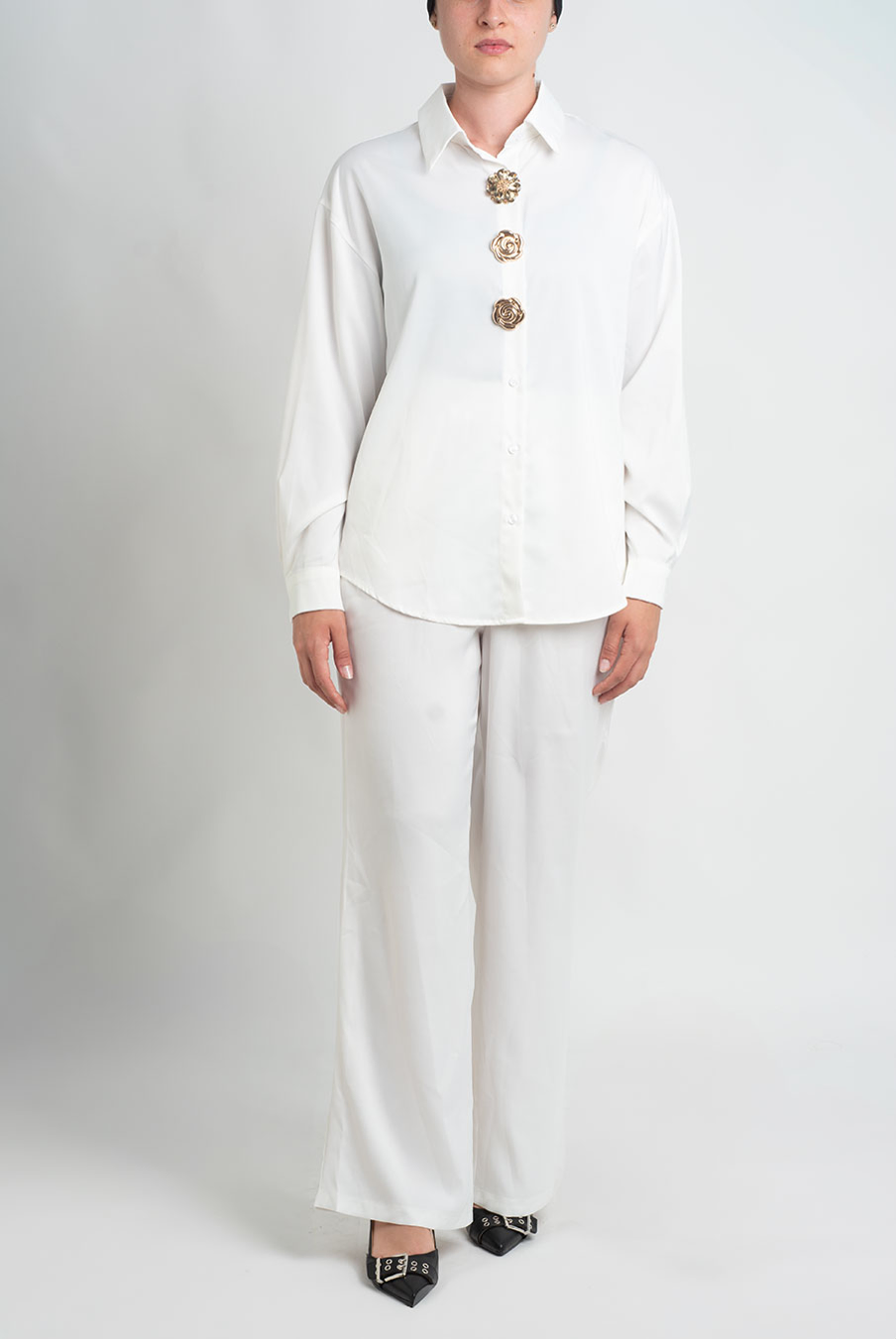 A calça é composta por bolsos e a camisa tem botões com formato de flores.