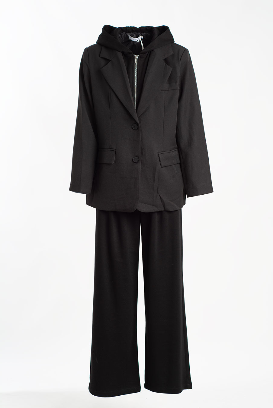 Conjunto com blazer e calças de corte fluido — moderno, confortável e cheio de estilo. O contraste entre o blazer estruturado e a camisola com capuz cria um visual casual-chic perfeito para o dia a dia.