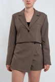 Conjunto de duas peças, composto por saia-calção e blazer curto.