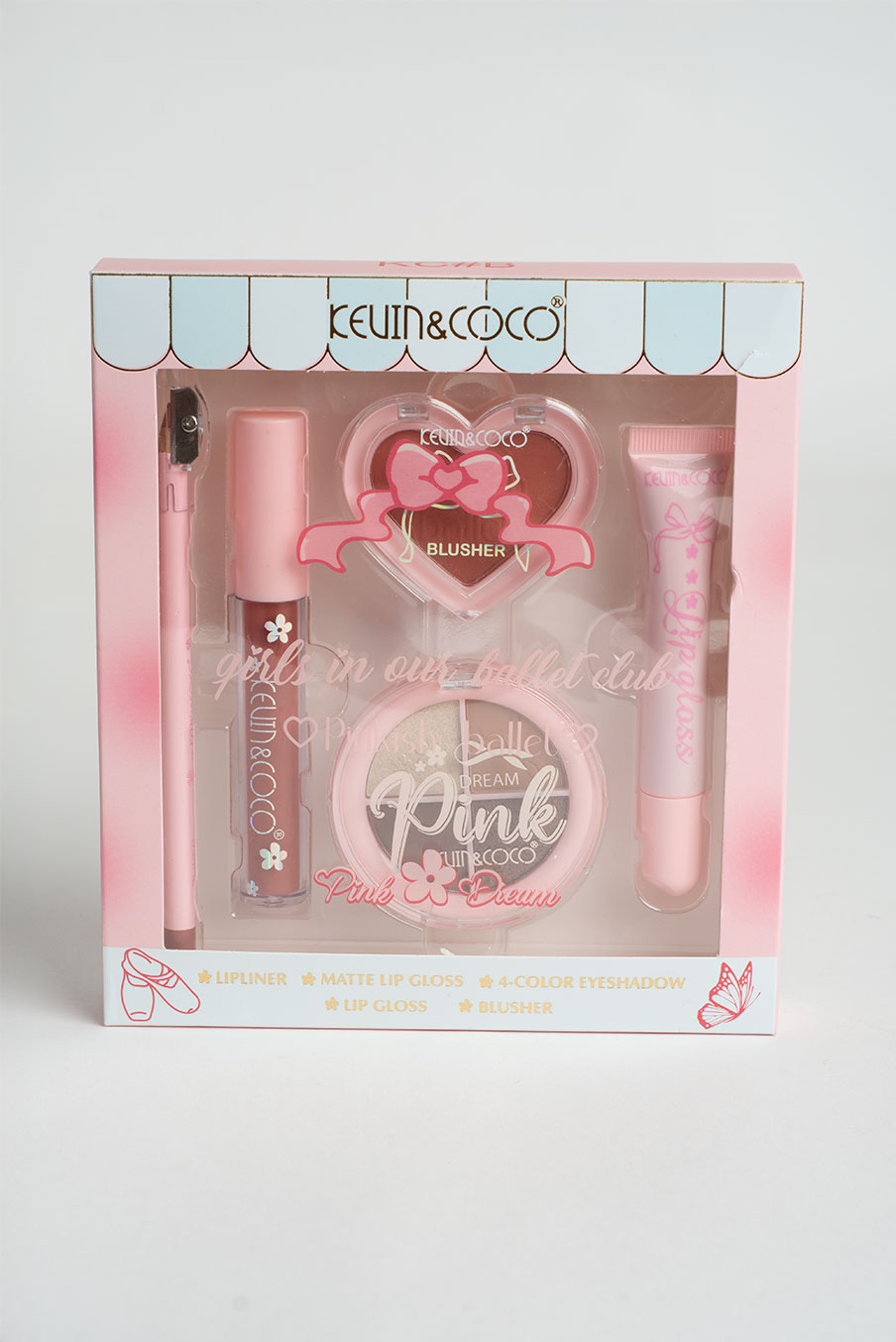 Inclui lápis de lábios, gloss matte, sombra de olhos com 4 tons, blush e lip gloss — tudo o que precisas para realçar a tua beleza com um toque delicado e feminino. Embalagem irresistível em tons pastel, inspirada no universo do ballet, ideal para oferecer ou transformar a tua rotina de maquilhagem num momento de sonho. ✨