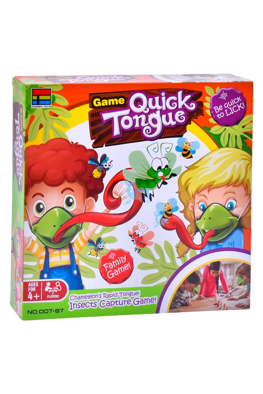 Jogo Quick Tongue — um jogo de família super divertido em que os jogadores colocam máscaras de camaleão e tentam capturar insetos com a língua mais rápida! 🦎