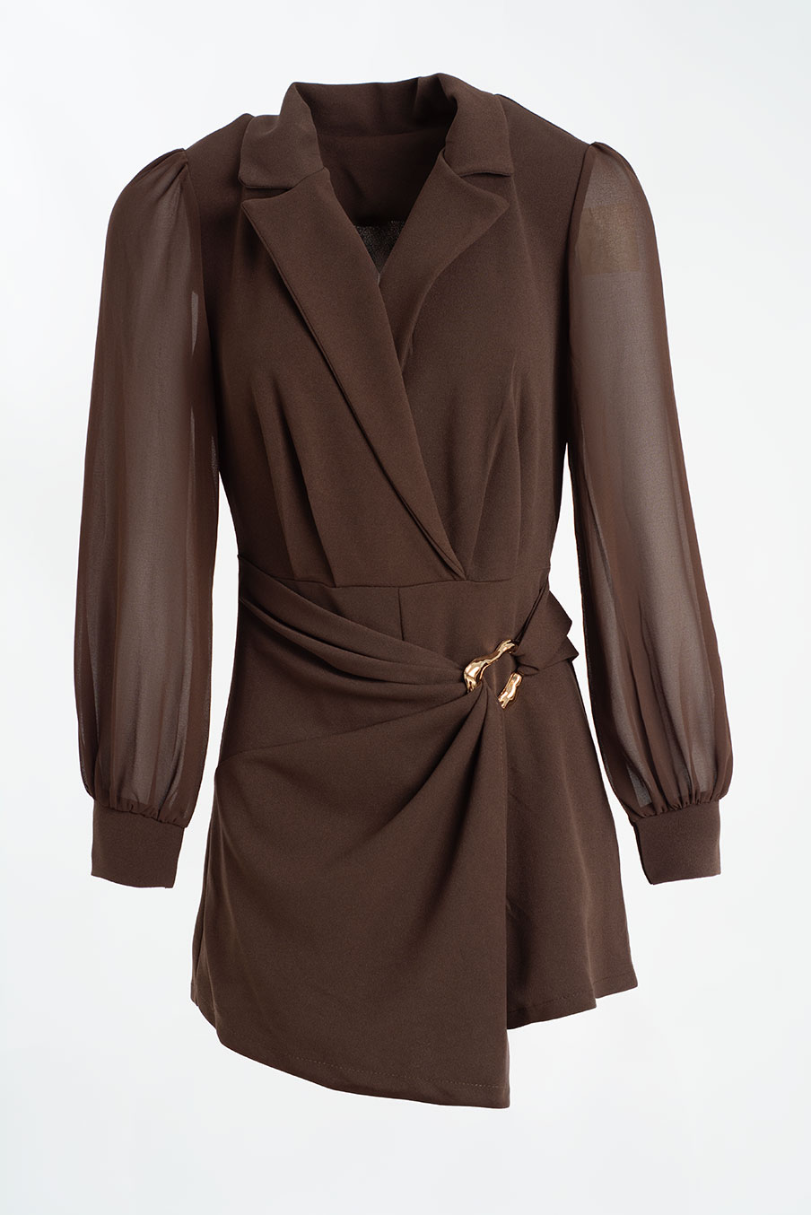 Macacão curto com mangas transparentes e detalhe drapeado com fivela — sofisticado, elegante e cheio de charme. Ideal para criar um look refinado com um toque de sensualidade discreta.