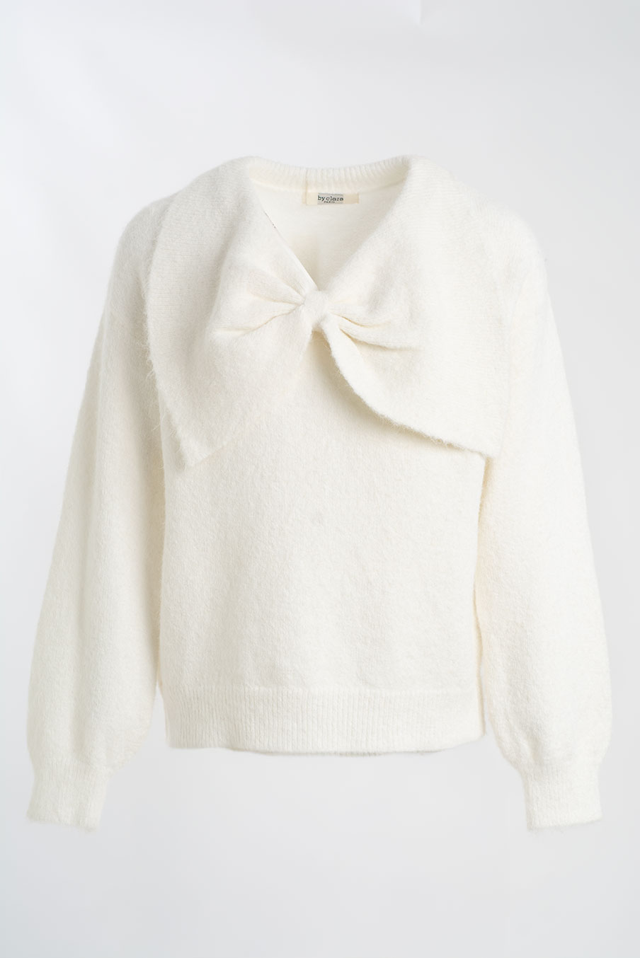 Malha macia com gola laço oversized. Peça divertida e cozy, perfeita para dar cor e estilo aos dias frios.