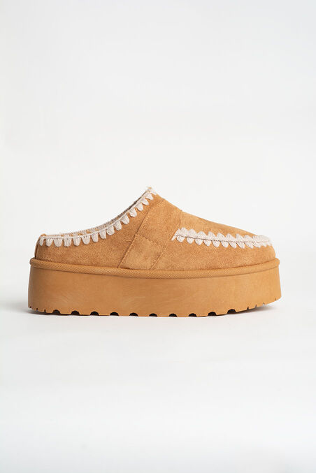 Chinelos com plataforma e acabamento em camurça suave. Detalhes bordados no rebordo e sola robusta, perfeitos para conforto com estilo.