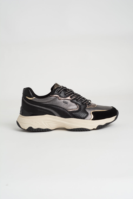 Ténis de inspiração chunky com mistura de texturas e detalhes contrastantes, que combinam estilo moderno com conforto absoluto. Ideal para quem procura um visual desportivo e urbano com um toque de sofisticação.