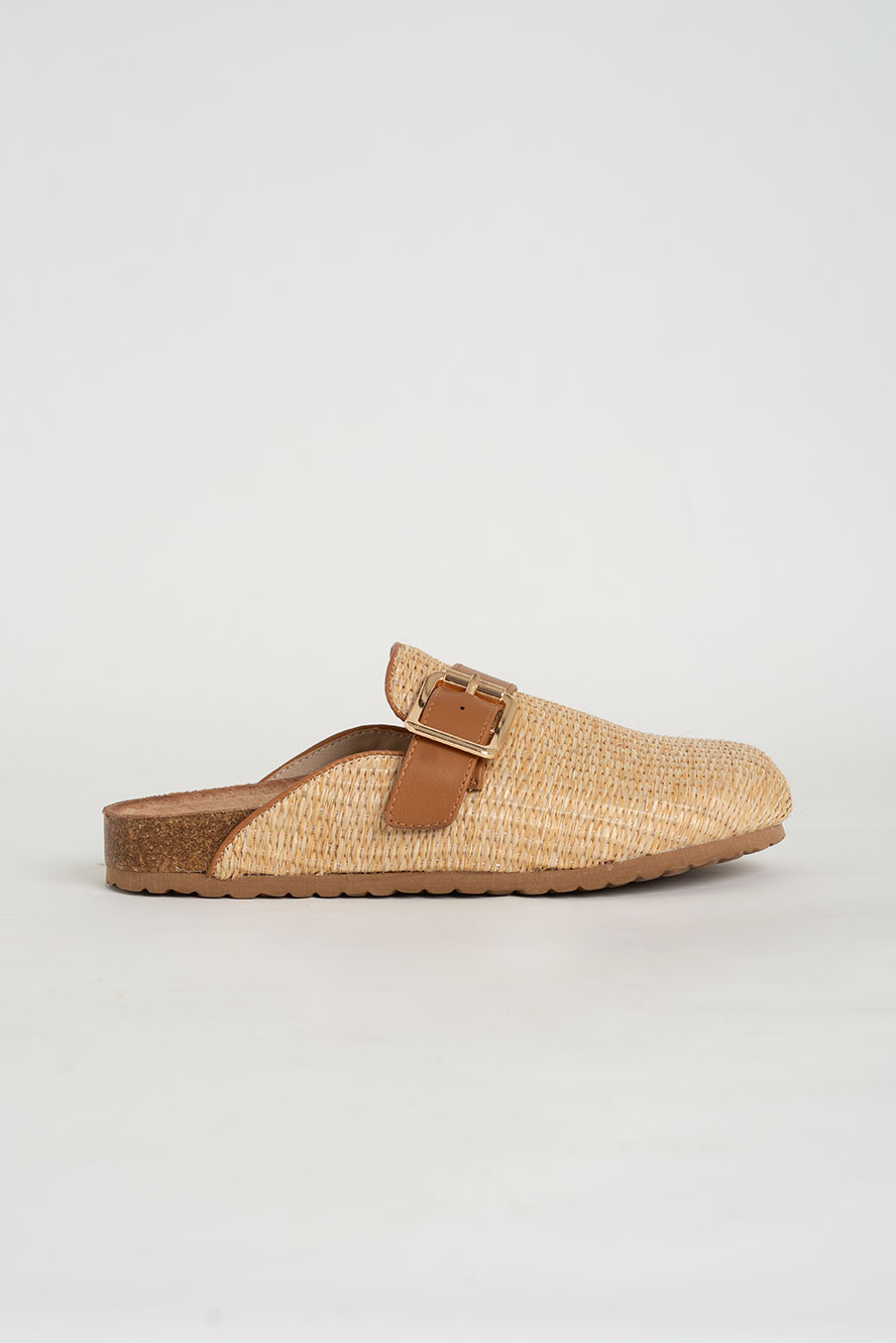 Tamanco estilo clog com acabamento em ráfia, perfeito para um look de verão descontraído e cheio de estilo. O modelo conta com fivela metálica ajustável em tom dourado e tira em contraste castanha, que traz um toque elegante.