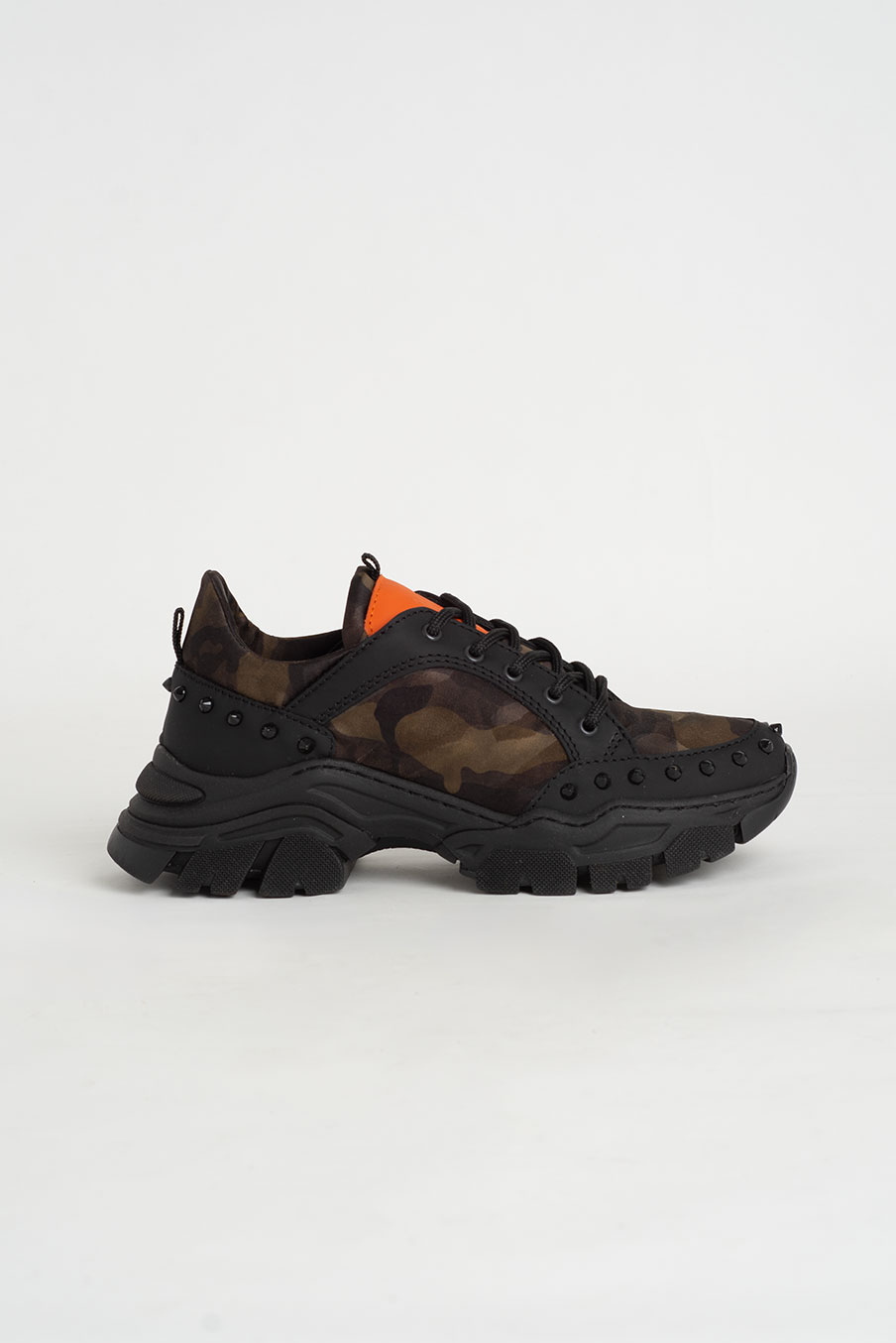 O padrão camuflado com detalhes em preto e apontamentos em laranja dá-lhes um toque moderno e irreverente, enquanto a sola robusta assegura estabilidade e um visual contemporâneo.