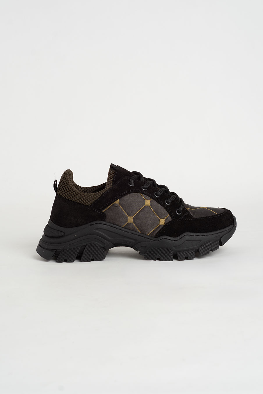 A conjugação de pele genuína com camurça preta e padrão geométrico dourado confere-lhes um visual sofisticado e arrojado.