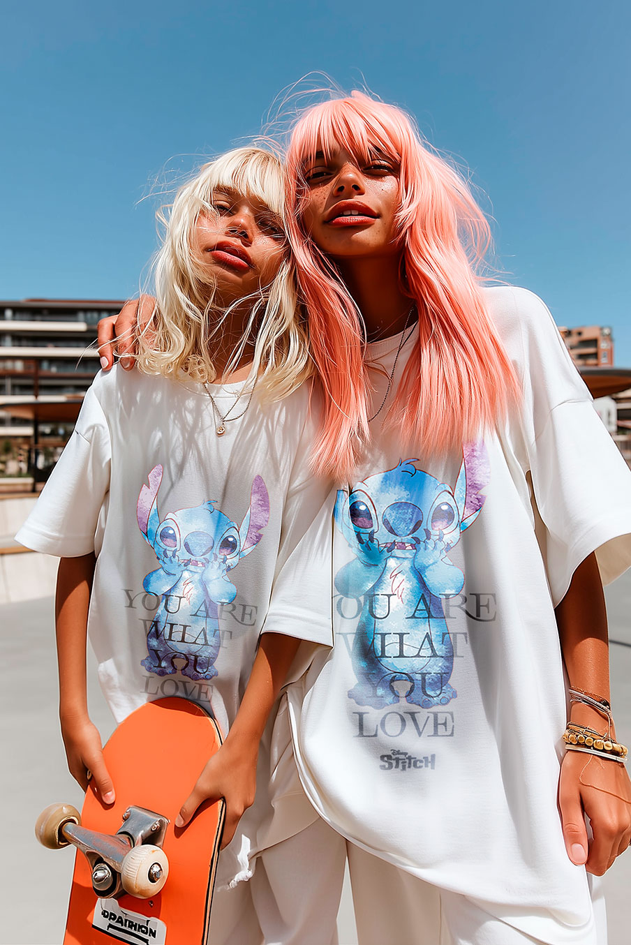 Uma t-shirt com Stitch e uma mensagem que é puro carinho: somos aquilo que amamos — e partilhar isso com quem mais amamos é ainda melhor.