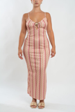 Vestido longo estampado com alças finas, detalhe em forma de concha no peito e racha lateral.