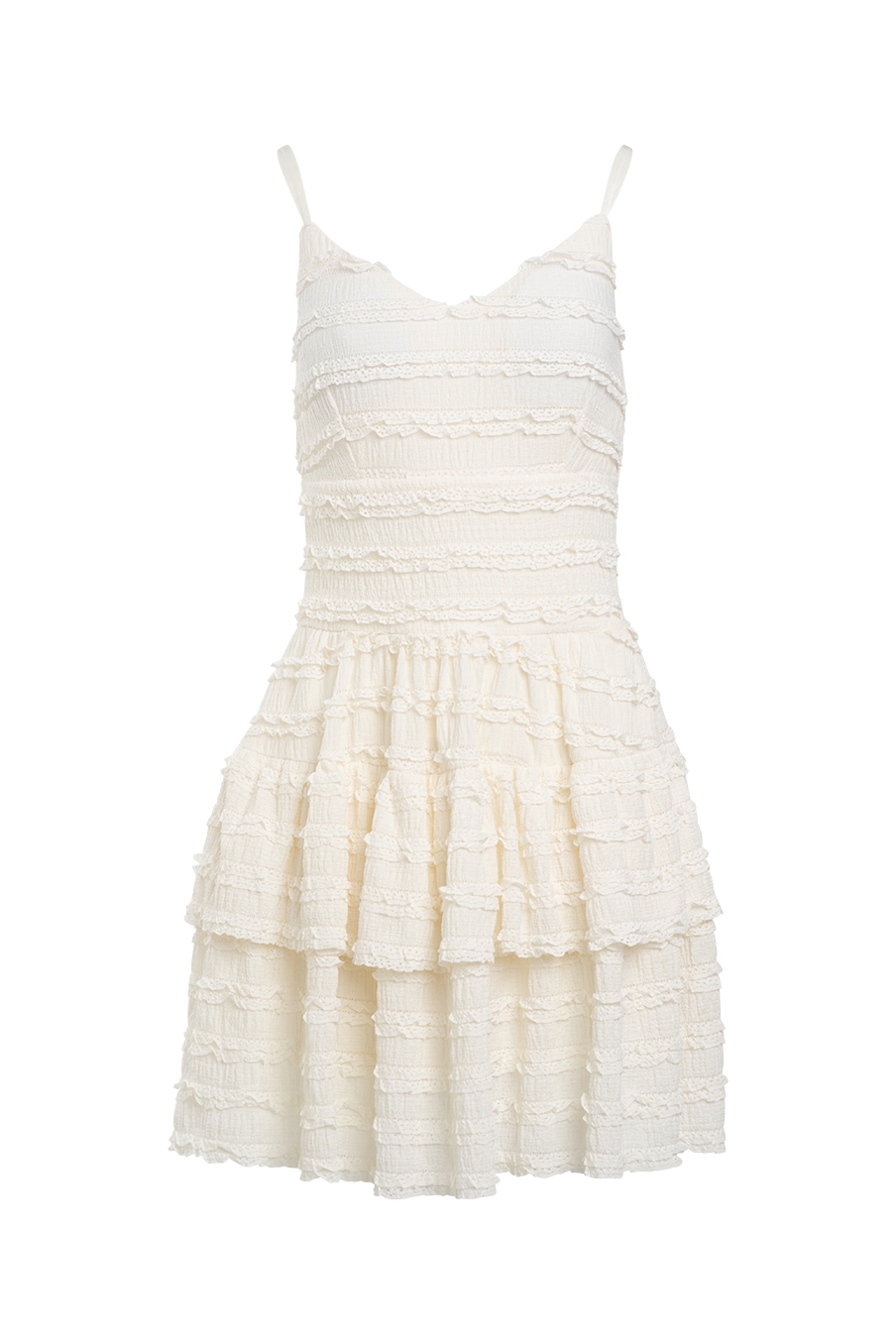 Vestido com efeito handmade composto por uma silhueta com caimento fluido e delicado.