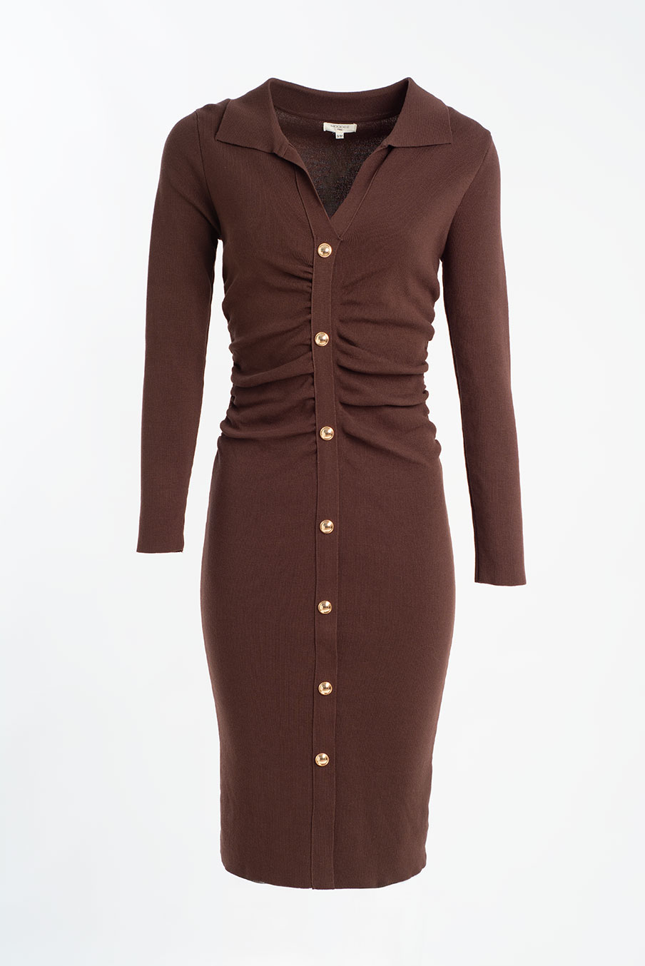 Vestido de malha com botões frontais e detalhe franzido — justo, elegante e confortável. Uma peça versátil que realça a silhueta e resulta em looks sofisticados com um toque casual.